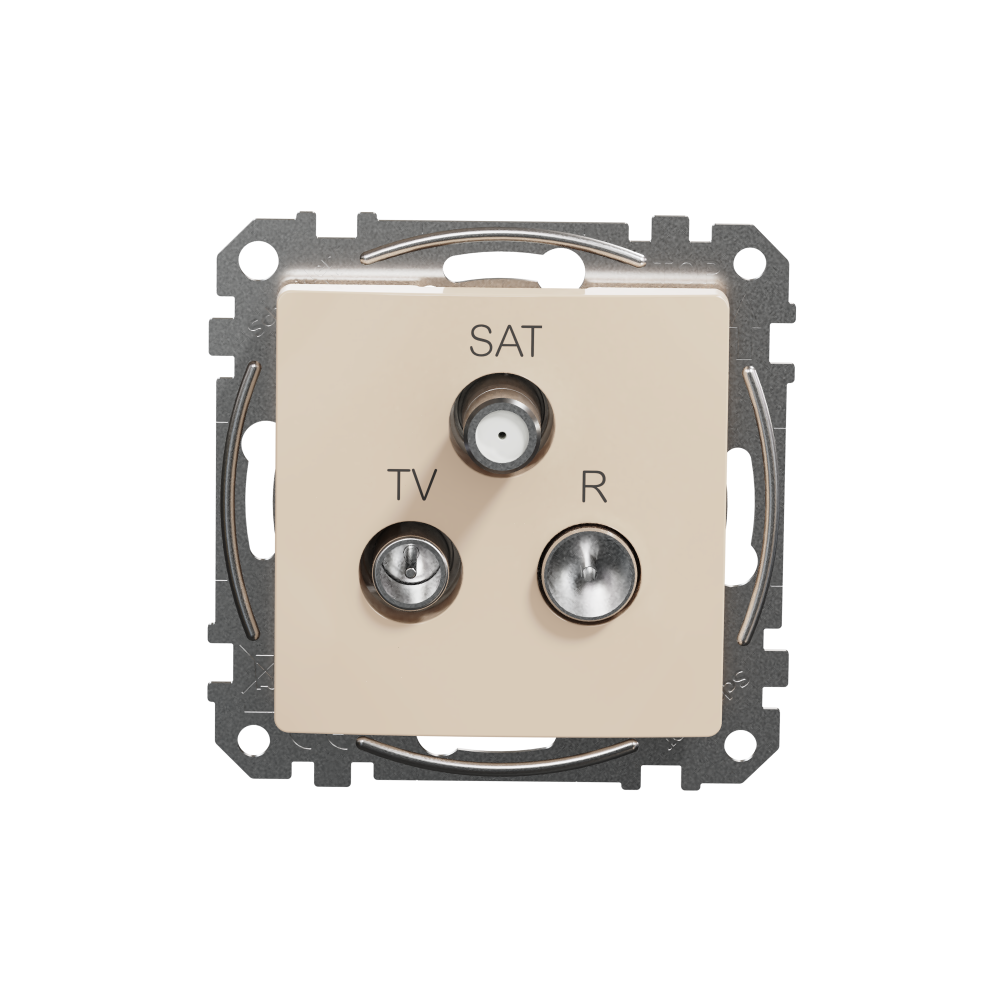 Sedna Gniazdo R/TV/SAT przelotowe (10dB), beżowy, to osprzęt serii Sedna Design marki Schneider Electric. Gniazdo R/TV/SAT przelotowe (10dB) ma lśniące wykończenie powierzchni w kolorze beżowym i posiada następujące wymiary: szerokość 73 mm, wysokość 73 mm, głębokość 41 mm, głębokość wystawania 17.4 mm. Gniazdo charakteryzuje się stopniem ochrony IP20. Do produkcji gniazda wykorzystano tworzywo termoplastyczne o zwiększonej odporności na promieniowanie UV. Produkt jest montowany podtynkowo.