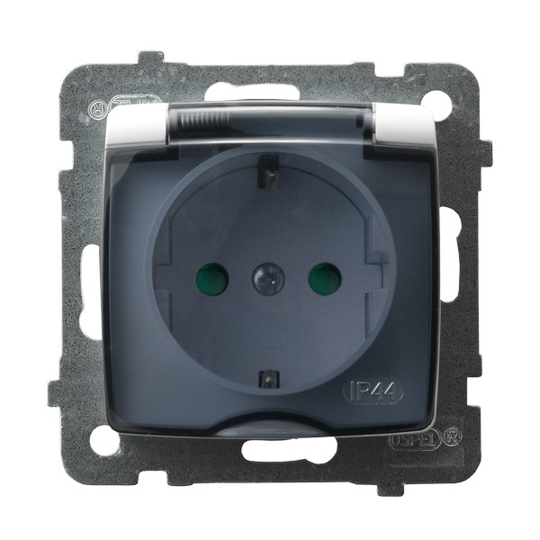 Gniazdo wtyczkowe, bryzgoszczelne, jednofazowe (2P+Z) z uziemieniem, z przesłonami torów prądowych, które uniemożliwiają użycie gniazdka niezgodnie z przeznaczeniem. Blokada ustaje po wywarciu nacisku na bolec. Zastosowanie w pomieszczeniach wilgotnych. lub do użytku zewnętrznego. IP oznacza "Index of Protection", 44 - Ochrona przed obiektami większymi niż 1mm, ochrona przed wodą bryzgającą ze wszystkich kierunków. Na specjalne zamówienie istnieje możliwość wykonania gniazd z zaciskami bezgwintowymi. Gniazda bryzgoszczelne w kolorze białym i ecru dostępne są również z wieczkami w kolorze produktu.
