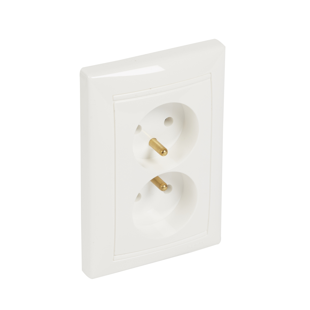 Mechanizmy gniazd podwójnych dostarczane z plakietką. Wyposażone w metalowy uchwyt do montażu w puszce przy użyciu pazurków lub wkrętów. Wyposażone w podwójne zaciski śrubowe