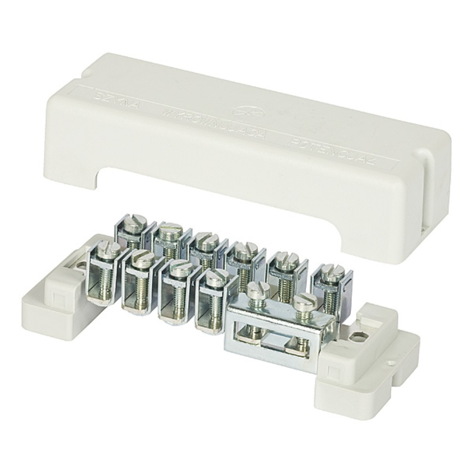 Szyna SWP-G1 przeznaczona jest do wykonania głównych połączeń wyrównawczych. W szynie łączy się ze sobą: przewody ochronne instalacji elektrycznej wszystkie metalowe ciągi instalacyjne dochodzące do budynku (rury wody pitnej, rury wody gorącej, rury CO, gazowe itp.) wszystkie uziemienia naturalne i sztuczne (uziomy fundamentowe, odgromowe itp.) metalowe konstrukcje i zbrojenia budynku Szyna posiada 10 zacisków 35mm2 i jeden dodatkowy przeznaczony do przyłączenia płaskownika (bednarki) 4x30mm. Stalowe zaciski (Fe/Zn) mogą być ustawione w dowolnej konfiguracji na listwie z mosiądzu (Mo/Sn). Szyny mocowane są do podłoża za pomocą wkrętów. Zaciski zabezpieczone są pokrywkami z tworzywa sztucznego (ABS). Na wewnętrznej części pokrywek znajdują się tabliczki, na których w łatwy i czytelny sposób można oznaczyć poszczególne zaciski. W szynach są otwory umożliwiające ich zaplombowanie. Norma: IEC 60947-7-2 Przekrój znamionowy: 35mm2 Przyłączalność znamionowa: [drut] 10×4…35mm2 [taśma] 1x(4×30)mm Materiał izolacyjny: ABS Temperatura otoczenia: -25…+100°C Masa: 301g